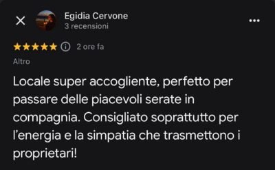 Divertimento assicurato Locale intimo e accogliente ma dove il divertimento è assicurato grazie allo staff simpatico e coinvolgente. Belle le serate karaoke o quella della tombola natalizia. Ottima selezione di vini. Consigliato per una serata in da passare con spensieratezza in compagnia.